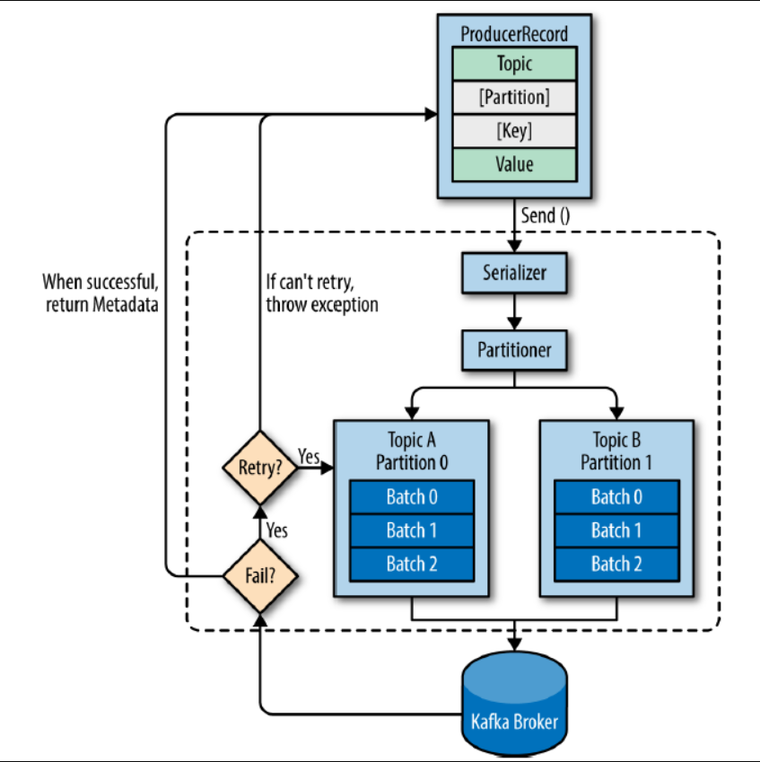 (5) send() 메소드 동작 이후 레코드들을 프로듀서가 카프카로 전송하기 전에 배치 전송을 하기 위해서파티션 별로 잠시 모아둠. 전송이 실패되면 재시도 동작이 이루어지게 되고 지정한 횟수만큼 재시도가 실패하면 최종 실패로 전달하게 되고, 전송이 성공되면 성공에 대한 메타데이터를 리턴