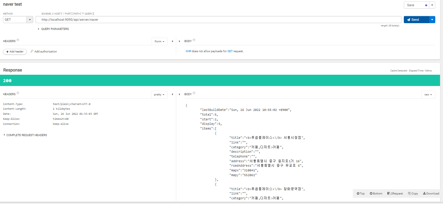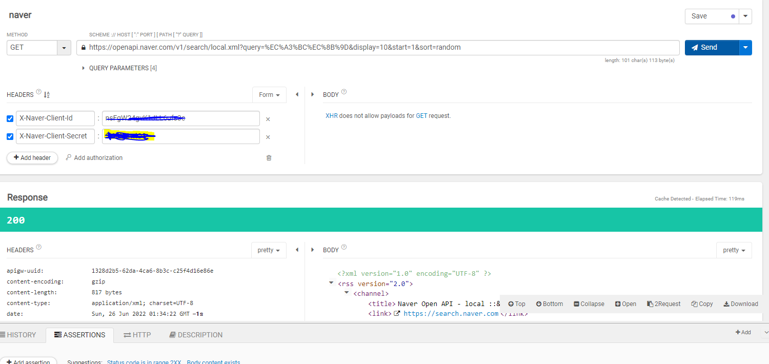 Header 에 X-Naver-client-id , -X-Naver-Client-Secret가 필요함