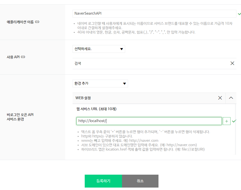 - 애플리케이션 등록: 네이버 오픈 API로 개발하시려면 먼저 'Application-애플리케이션 등록' 메뉴에서 애플리케이션을 등록하셔야 합니다.