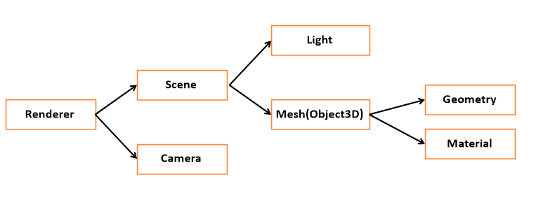 Three.js 앱의 구조부터 간략히 살펴보면 다음과 같다. Three.js 앱을 만들려면 다양한 객체를 생성해 연결해야 합니다. 아래는 Three.js 앱의 구조를 도식화한 것입니다.