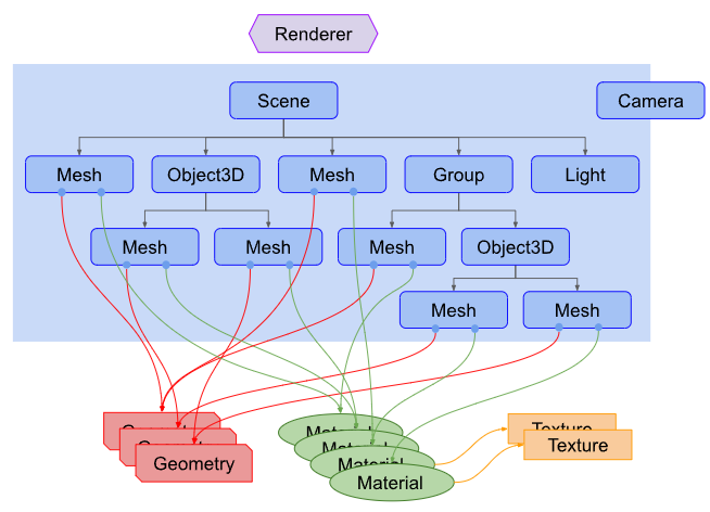 Material과 Gemoetry는 재사용이 가능해 여러개의 Mesh가 하나의 Material과 Gemoetry를 동시 참조가 가능하다.