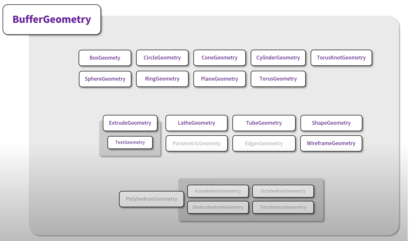 아래 그림은 Three.js 에서 제공하는 BufferGeometry 를 상속받아 사용할 수 있는 Geometry를 보여준다.