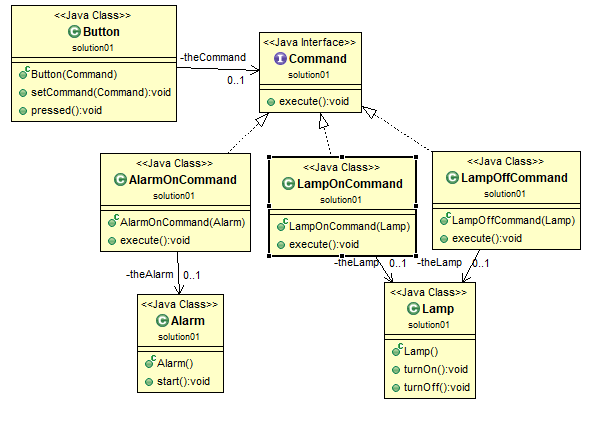 이렇게 새로운 기능을 추가하거나 변경해도, Button 클래스를 재사용할 수 있도록 할 수 있는것이 Command Pattern인 것이다. Button 클래스의 변경없이 구현하고자 어떻게 해야되는지 알아보자. 기존의 알람기능, 램프기능에 램프는 키고 끄는 기능을 추가하여 만들었다. 먼저 UML에 대해서 보자.