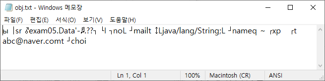 Serizable 된 Data 객체를 obj.txt 파일에다가 ObjectOutputStream을 이용해 저장하고 ObjectInputStream을 사용해 역직렬화하여 Data객체를 복구 해오는 것을 볼 수 있습니다.