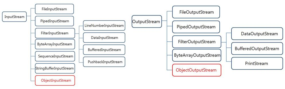 - ObjectOutputStream 과 ObejctInputStream은 각각 객체를 직렬화, 역직렬화하는 메소드를 제공하는 스트림이다.