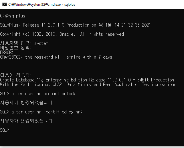 SQL> alter user hr identified by hr; // 비밀번호 새로 설정