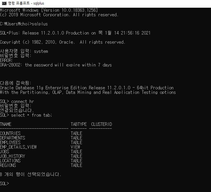 SQL> select * from tab; // 이 명령을 쳐서 테이블이 출력되면 완료