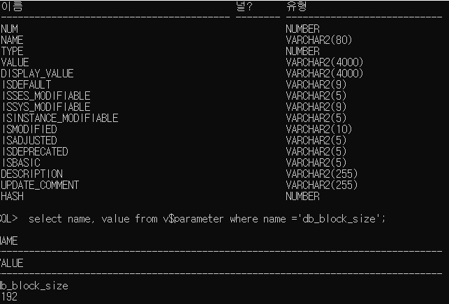 - 데이터 블록 크기는 db_block_size라는 설정 값에 저장됨.