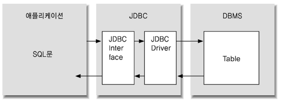- 애플리케이션에서 SQL문을 만들어 JDBC interface를 통해 전송하면 실제 구현 클래스인 JDBC Driver에서 DBMS에 접속하여 SQL문을 전송한다. 그에 따른 결과를 다시 응용프로그램에게 전달한다.