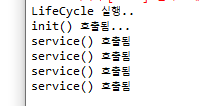 F5를 눌러 새로고침할때 service() 메서드만 실행되는 것을 볼 수있다. 처음임에만 servlet을 초기화한후 그뒤로는 초기화 되지 않는다. 즉 처음 servlet을 호출할때만 실행시간이 조금 걸리고 그뒤에는 메모리에 올라와있으므로 빠르게 요청을 처리할 수 있다.