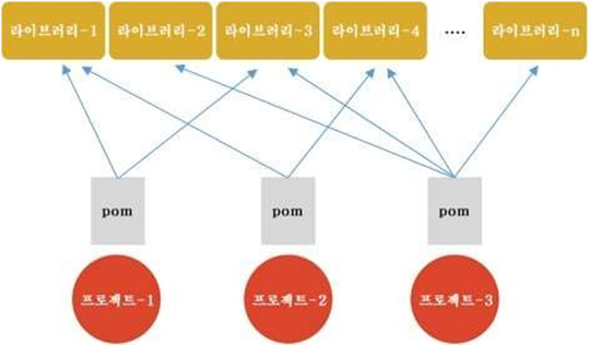 => 필요한 라이브러리를 특정 문서(pom.xml)에 정의해 놓으면 네트워크를 통해서 라이브러리들을 자동으로 다운 받아 줍니다.