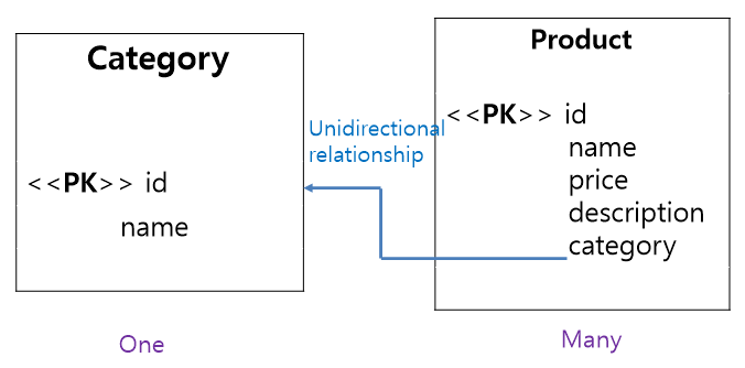 - Category (Parent) One side , Product(Child) Many Side <- 여기서 foreign key를 갖는다.