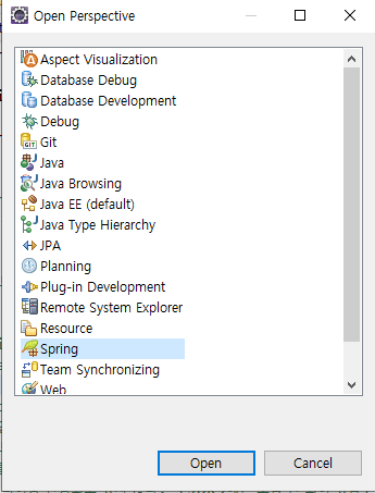 4) 오른쪽 상단에 perspective를 Spring 으로 변경한다.