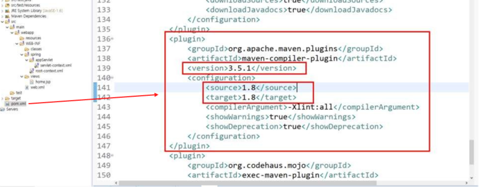 2. pom.xml의 <plugin> 태그 중 maven-compiler-plugin의 내용 변경