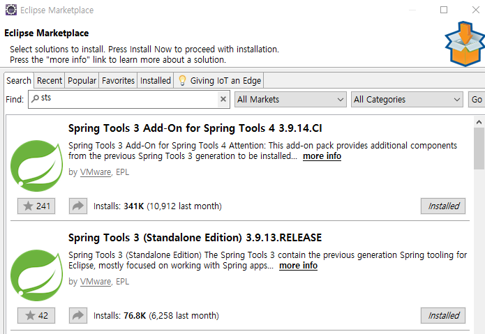 2) Marketplace에서 "sts" 를 검색해서 Standalon Edition 3.9.13 을 다운받는다.