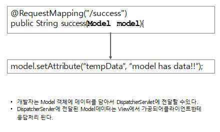 Controller에서 작업이 완료 후 DispatcherServlet에게 다시 올려주는데 이때 사용되는 객체가 Model과 View이다. 그 전에 컨트롤러에서 Model, View를 받을 수 있어야 한다. 이 후 DispatcherServler에 전달된 Model데이터는 View에서 가공되어 클라이언트에게 응답처리