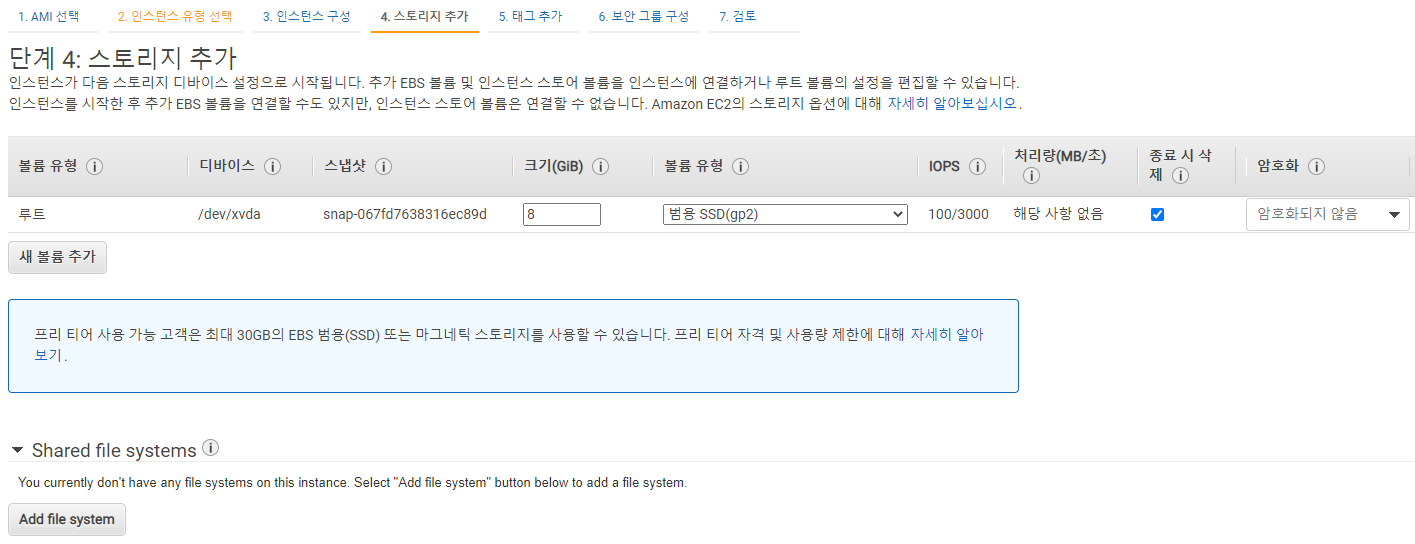 - Amazon Linux 2 AMI, SSD 사용 (Cent OS 호환되는 Linux)
