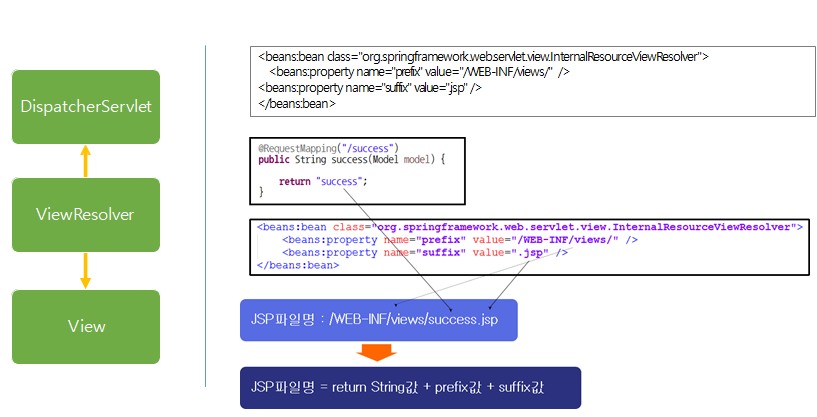 DispatcherServlet은 클라이언트에게 응답을 하기위해 ViewResolver에게 위임하여, View를 찾는다. Controller객체에 있는 리턴값과 InternalResourceView의 prefix, suffix 값을 찾아서 합쳐준다.